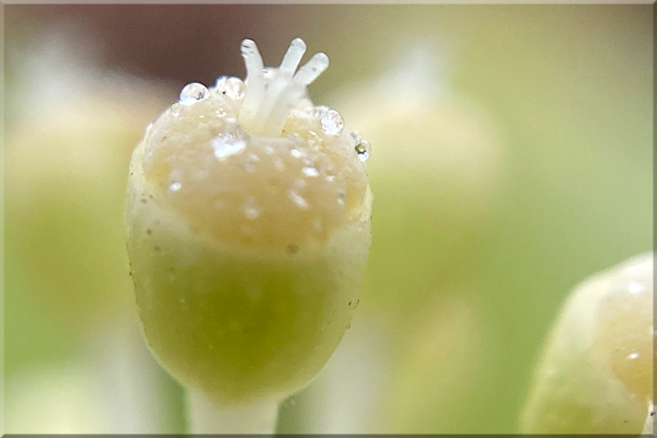 小石川植物園には目的の「ショクダイオオコンニャク」以外に珍しいお花がいっぱいで必見です。隣り合わせた紳士にマクロレンズを広報されたとか。^^ 小さな水滴も凄く可愛かったのですが、不思議なホヤ・ブレビアラタの花です。