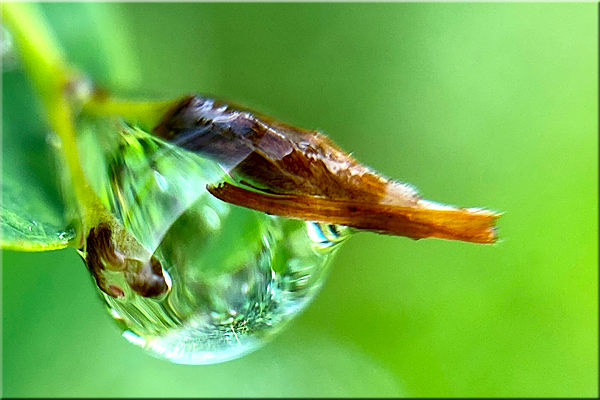つるバラの芽衣の、なんと葉っぱの裏側に着いた水滴、2枚載せてくださってますが、この模様は葉の葉脈なのかな、とっても面白いです。お洒落な構成の縦長写真が、ここでは写真が小さくなってしまうので少しカットしました、ごめんなさい。