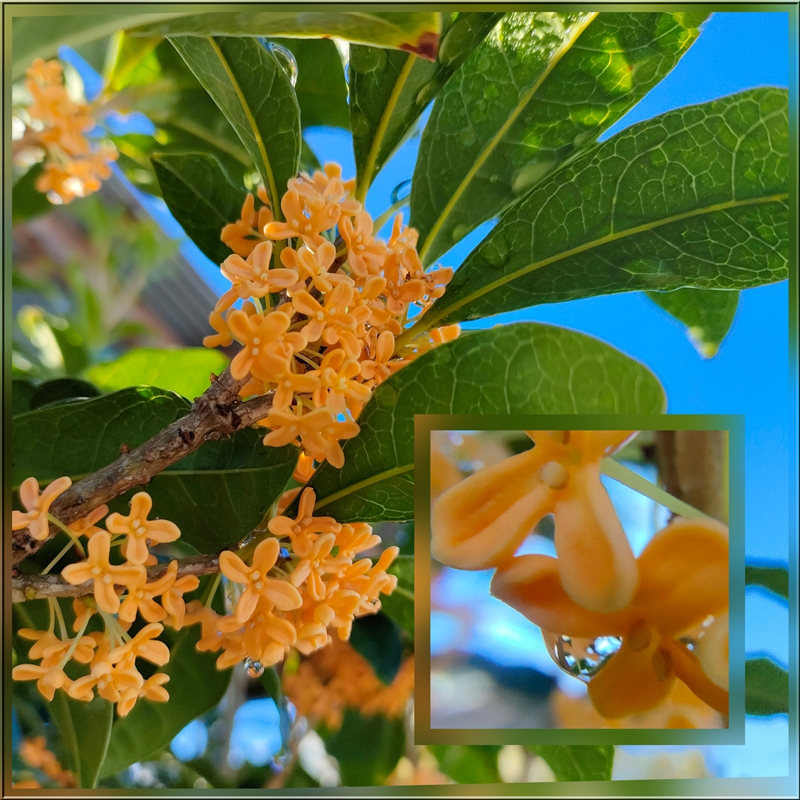 素敵なお散歩ポシェットを作られたチャメママさんのお庭は、今年も綺麗に咲いてくれたキンモクセイ、その小さな花びらに水滴が付き、その中にキンモクセイが映り込むと言うお洒落な構成で撮れているのが凄く素敵です。